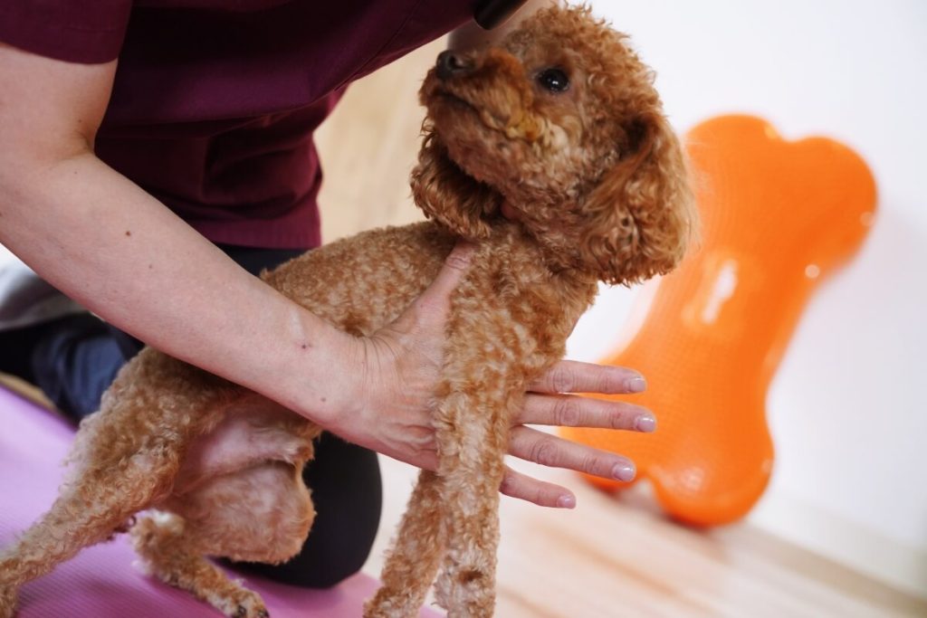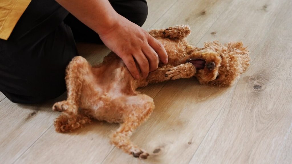 犬がリラックスした体勢から、足先を無理なく触れる状態を作ります。