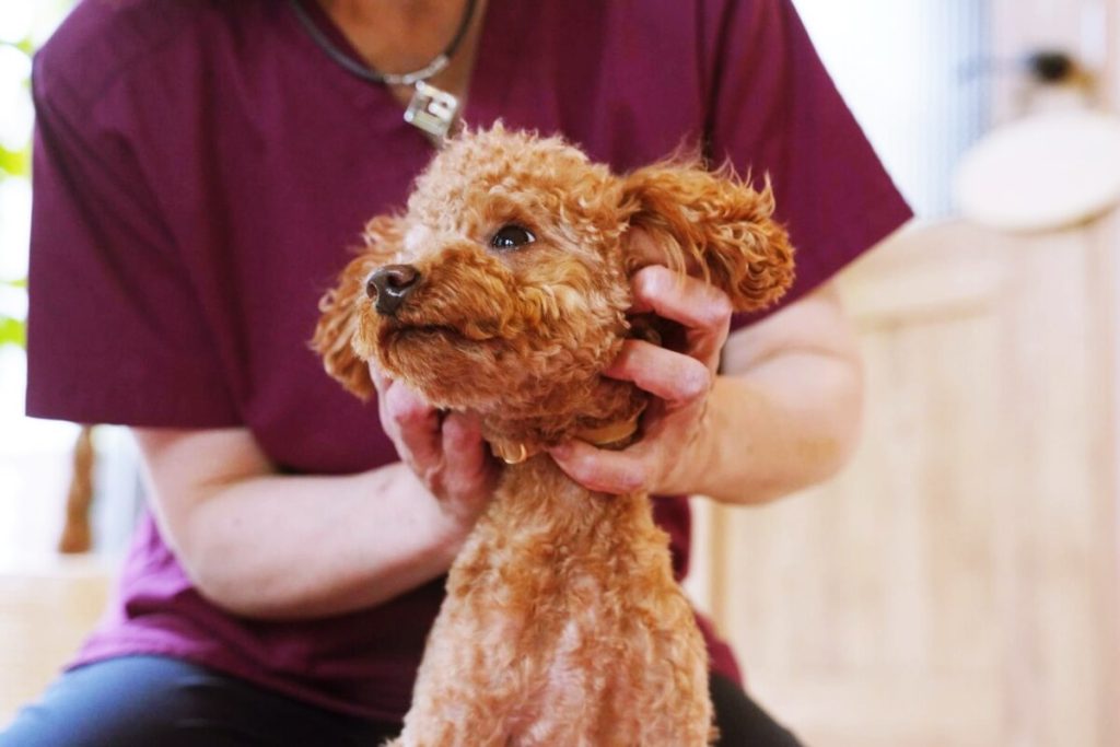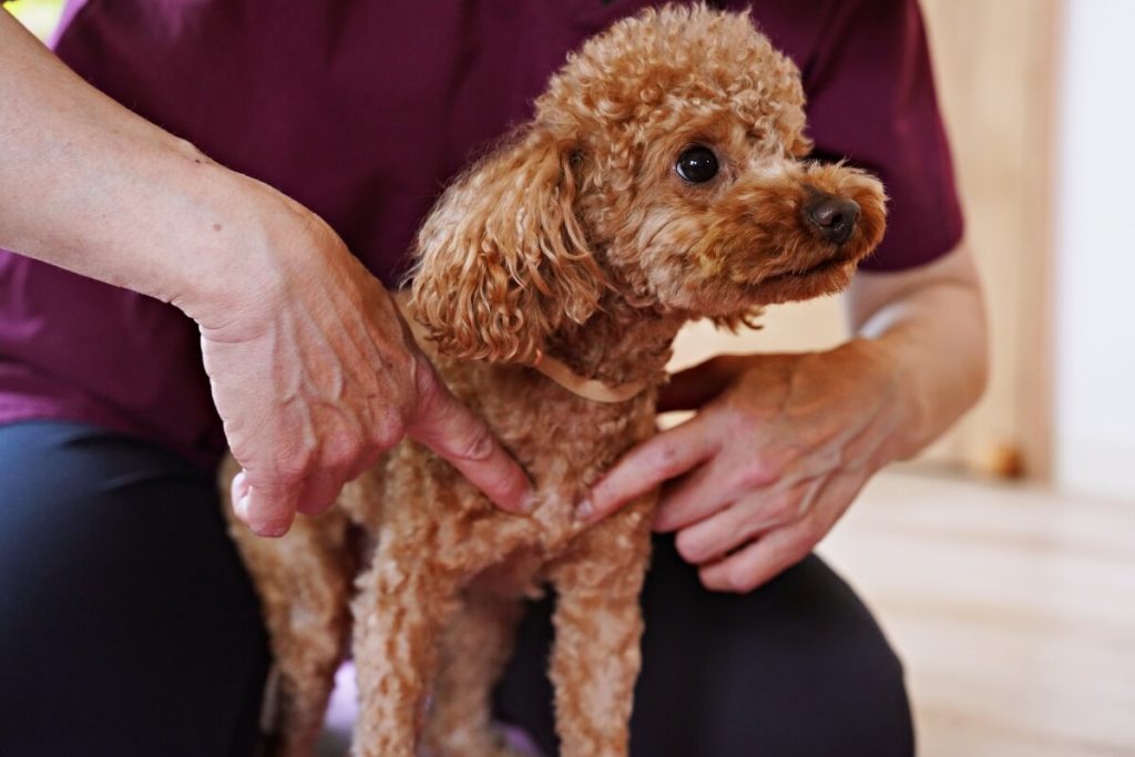 飼い主さんが犬の横に座ると手を添えやすく、犬も安心しやすいです。