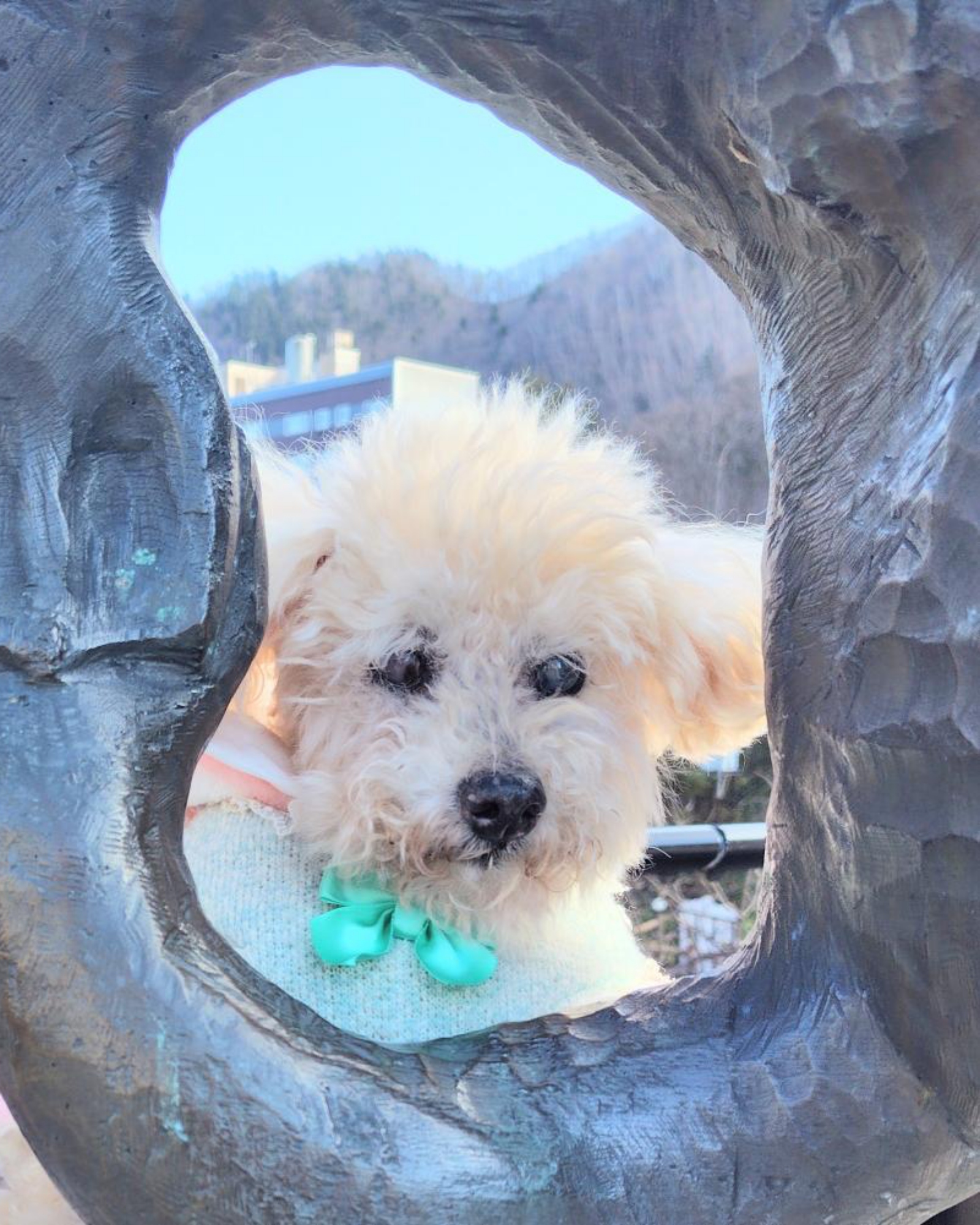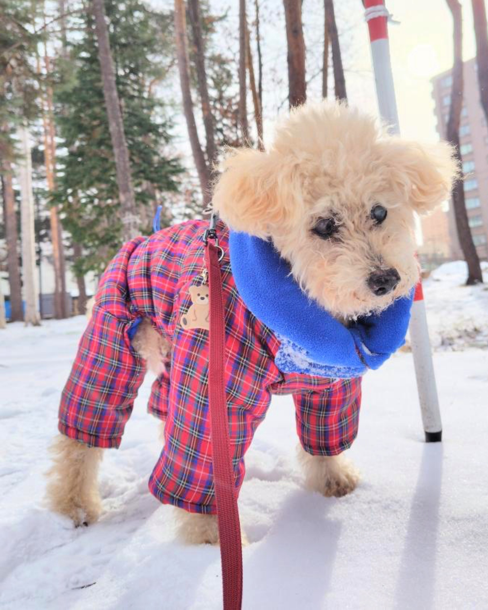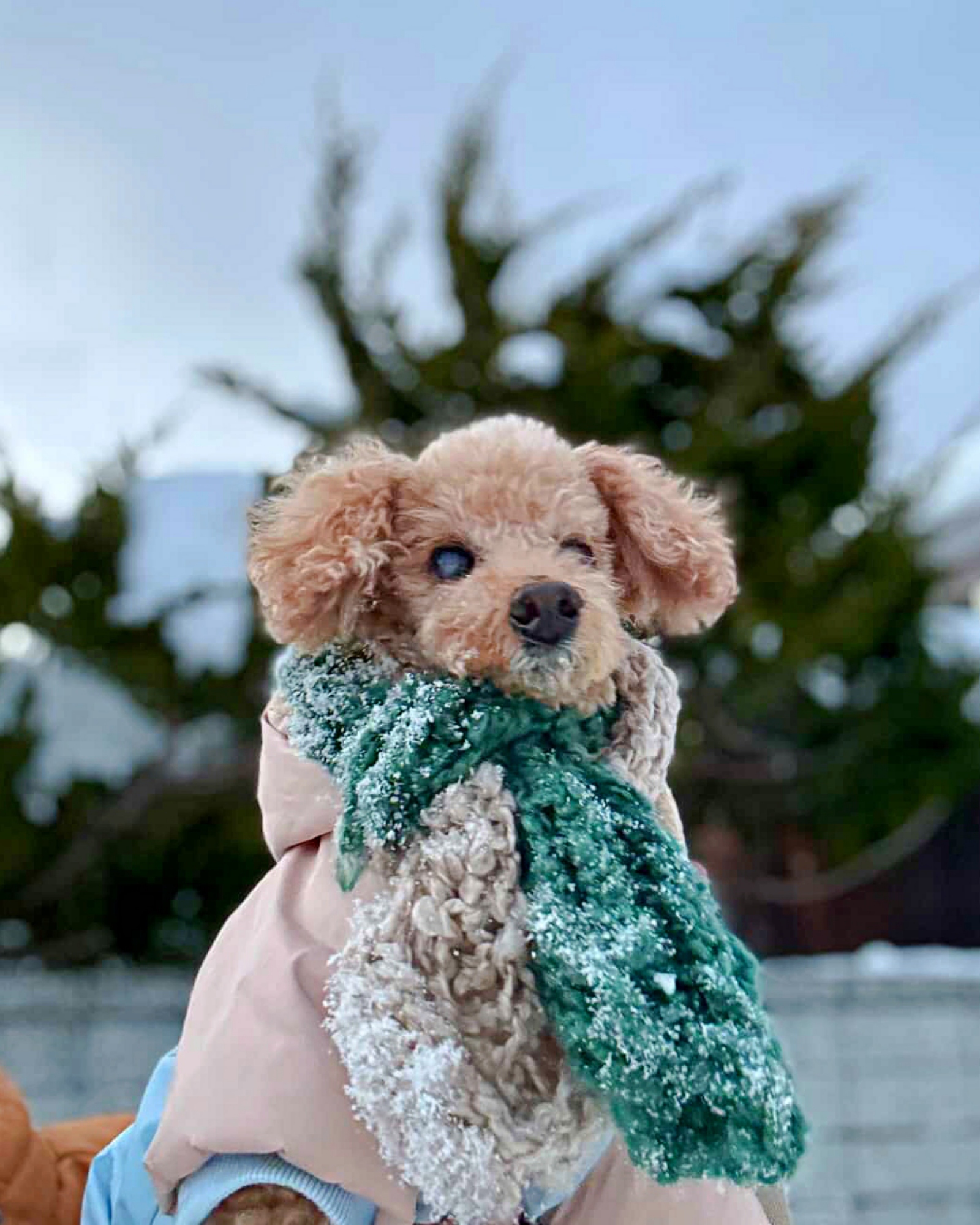 ところが案外、二重に巻くとちょうど良く、雪国で暮らすチョコくんは、ダウンや腹巻き、靴とともにマフラーを身につけて、散歩に出かけています。